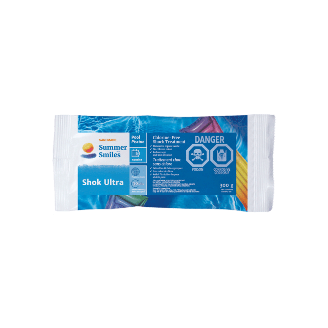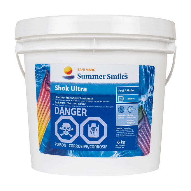 SHOK ULTRA est un traitement choc sans chlore qui détruit activement les déchets organiques comme la transpiration, les huiles corporelles et les cosmétiques qui s’accumulent dans l’eau des piscines. Sa formule sans chlore à action rapide est inodore et permet d’éviter l’irritation des yeux et de la peau due à une forte présence de chlore dans l’eau. L’efficacité de SHOK ULTRA n’est pas affectée par les rayons ultraviolets du soleil.