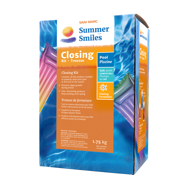The Summer Smiles™ CLOSING KIT will ensure your pool is properly closed at the end of the season. This kit will prevent algae growth over the winter and its slow-dissolving products will keep working until the spring to make opening the pool easier next season.
