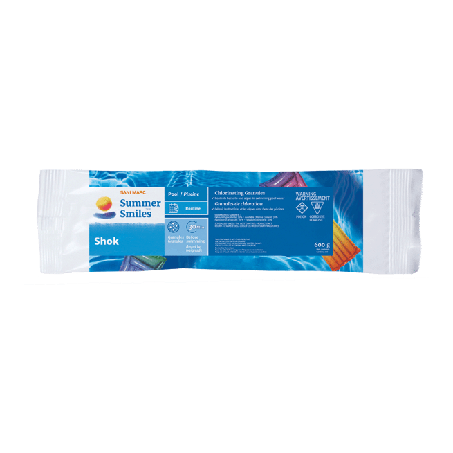 SHOK is a shock treatment that actively destroy organic waste such as perspiration, body oil and cosmetics that tend to cloud water. It is highly effective in treating algae, heavy algae or cloudy water. This reactivation treatment also clarifies cloudy water and keeps chlorine working longer.